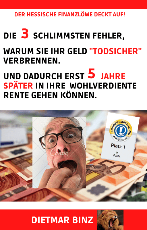 Laden Sie sich jetzt gratis mein E-Book „Die 3 schlimmsten Fehler, warum Sie Ihr Geld in der heutigen Zeit „todsicher“ verbrennen. Und dadurch erst 5 Jahre später in Ihre wohlverdiente Rente gehen können“.